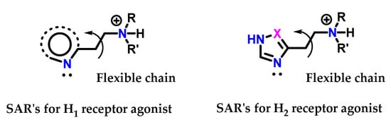 - Durant, G.J.; Ganellin, C.R.; Parsons, M.E. Chemical Differentiation of Histamine H1–and H2-Receptor Agonists. J. Med. Chem. 1975, 18, 905–909. [Google Scholar] [CrossRef]