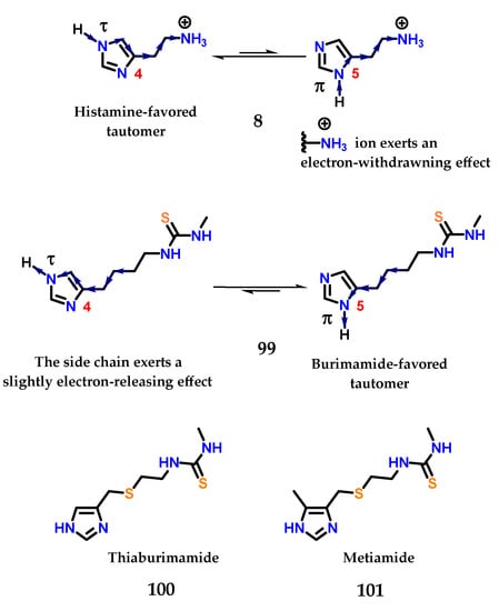 - Prout, K.; Critchley, S.R.; Ganellin, C.R.; Mitchell, R.C. Crystal and Molecular Structure of the Histamine H 2–Receptor Antagonists, N–Methyl-N′–{2-[(5-Methylimidazol–4–Yl) Methylthio] Ethyl} Thiourea (Metiamide) and N–{2-[(Imidazol–4–Yl) Methylthio] Ethyl}-N′–Methylthiourea (Thiaburimamide). J. Chem. Soc. Perkin. Trans. 2 1977, 68–75. [Google Scholar] [CrossRef]