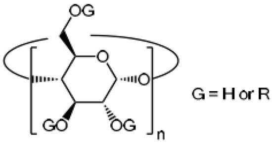 CDs are cyclic oligosaccharides made from starch by enzymatically cleaving the amylose helix. These ring-shaped molecules are very hydrophilic because their many hydroxyl moieties face outward. On the other hand, due to the glucosidic oxygen linkages, the inner side of the cavity is less hydrophilic. With the help of this structure, CDs can incorporate other less hydrophilic compounds (guests) into the cavity, creating what are known as host–guest inclusion complexes. Because of the CD cavity’s molecular size, the majority of medications, tastes, cosmetic compounds, insecticides, etc., can be molecularly enclosed there. The size of the guest affects the complex’s stoichiometry. Through particular synthetic processes, the many hydroxyl groups are easily changed to create different CD derivatives [148] (Figure 6).