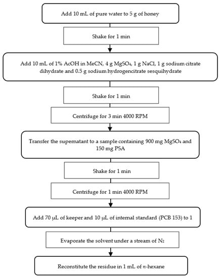 - Herrera, A.; Perez-Arquillue, C.; Conchello, P.; Bayarri, S.; Lazaro, R.; Yague, C.; Arino, A. Determination of pesticides and PCBs in honey by solid-phase extraction cleanup followed by gas chromatography with electron-capture and nitrogen–phosphorus detection. Anal. Bioanal. Chem. 2005, 381, 695–701. [Google Scholar] [CrossRef]