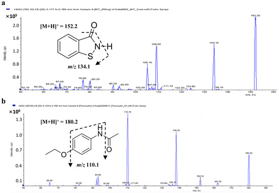 Chemical structures and product ion mass spectra of (a) benzisothiazolinone and (b) phenacetin, with [M + H]+ at m/z 152.2 and 180.2 as the precursor ions.
