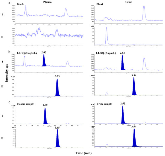 Representative chromatograms of benzisothiazolinone (BIT) (I) and phenacetin (IS) (II) in plasma and urine: (a) double blank plasma or urine; (b) blank plasma or urine spiked with BIT at the LLOQ (2 ng/mL for plasma and urine) and the IS; (c) a plasma sample from 90 min after intravenous injection of 10 mg/kg BIT and a urine sample collected from 0 to 24 h after intravenous injection of 10 mg/kg BIT.