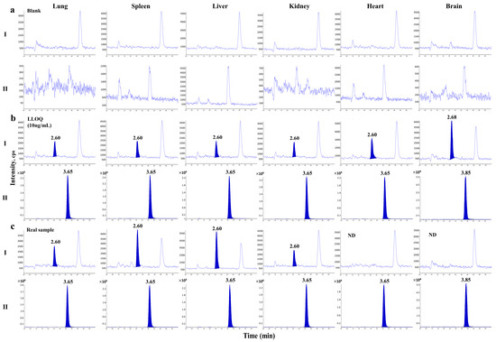 Representative chromatograms of BIT (I) and phenacetin (IS) (II) in six rat homogenates (lung, spleen, liver, kidney, heart, and brain): (a) double blank tissue homogenates; (b) blank tissue homogenates spiked with BIT at the LLOQ (10 ng/mL) and the IS; (c) real samples for lung and spleen from 180 min after intravenous administration of 10 mg/kg BIT and real samples for liver and kidney from 30 min after intravenous administration of 10 mg/kg BIT. ND, not detected.