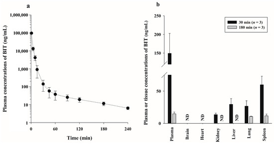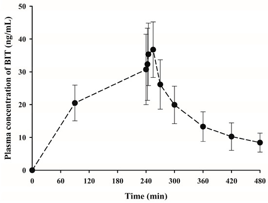 BIT was intravenously injected into rats (n = 6) at a dose of 10 mg/kg. The plasma concentration–time profiles of BIT are shown in Figure 4a, and the relevant pharmacokinetic parameters are listed in Table 4. BIT was removed rapidly from the systemic circulation, with a terminal half-life (t1/2) value of 79.2 ± 10.4 min and a total body clearance (CL) value of 28.3 ± 3.79 mL/min/kg. The volume of distribution in a steady state (Vdss) was relatively small at 129 ± 19.0 mL/kg, indicating that BIT distribution in tissues was limited. The percentage of unmetabolized BIT excreted in urine over the course of 24 h was almost negligible. The Ae0–24 h value was 0.0506 ± 0.0136%, suggesting that the majority (>99.95%) of BIT was eliminated via a non-renal (mainly hepatic) route. The percentage of unmetabolized BIT recovered from the gastrointestinal tract, including its contents and feces at 24 h (GI24 h), was 0.0324 ± 0.00639%, indicating that BIT was excreted into the bile and/or secreted into the gastrointestinal tract, although the proportion was very small (Table 4).