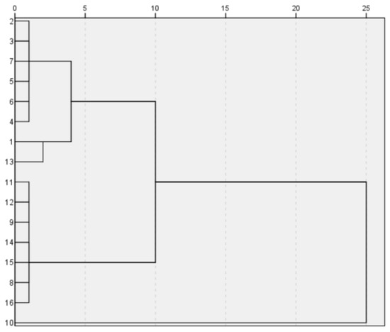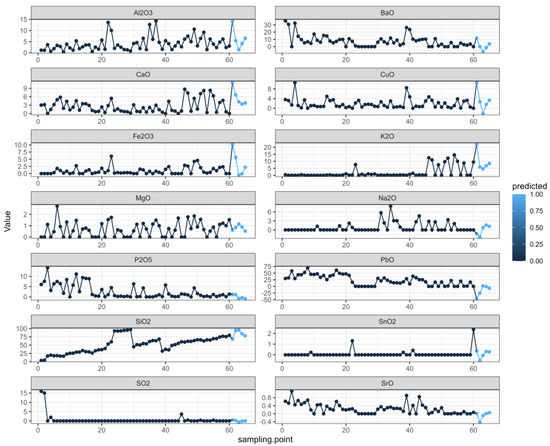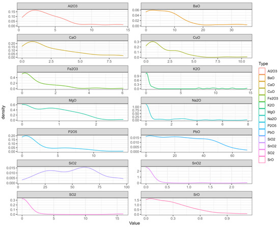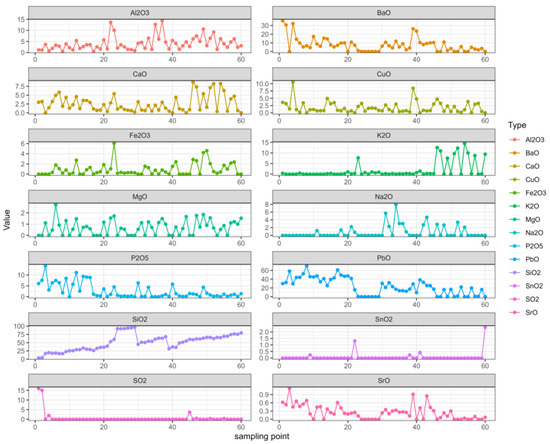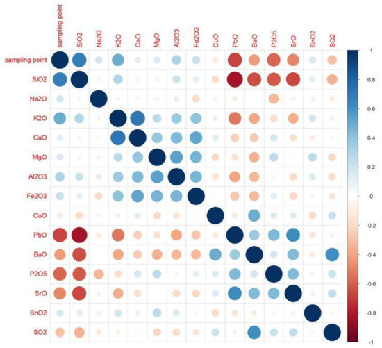 According to the calculation results, when the absolute value is closer to 1, the correlation is stronger. When the result is closer to 1, the positive correlation is stronger, and when the result is closer to −1, the negative correlation is stronger. Based on the results, we created an analysis diagram of the correlation between the variables. In Figure 4, it can be seen that there were many obvious correlations between the variables. The result on the diagonal is the correlation of each element with itself; since the result was 1, we chose to only examine the diagonal results. We found that silica, potassium oxide, lead oxide, barium oxide, phosphorus pentoxide, and strontium oxide had an obvious correlation with the artificial sampling points. The artificial sampling points are the parts of glass relics that are analyzed according to the weathering and the content of each element [28].