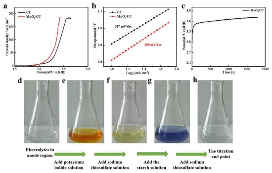 (a) OER polarization curves of CC and MnO2/CC catalysts in real seawater electrolyte; (b) Tafel slope; (c) potential vs. time at the current of 100 mA; (d–h) corresponding color changes during the titration.