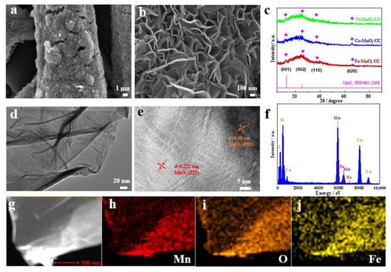 (a,b) SEM images of Fe-MnO2/CC; (c) XRD pattern of Fe-MnO2/CC; (d,e) TEM images of Fe-MnO2/CC; (f) EDS of Fe-MnO2/CC; (g) STEM image of Fe-MnO2/CC; (h) Mn elemental mapping of Fe-MnO2/CC; (i) O elemental mapping of Fe-MnO2/CC; (j) Fe elemental mapping of Fe-MnO2/CC.