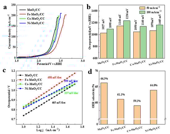 OER polarization curves (Figure 4a) of Fe-MnO2/CC, Co-MnO2/CC, Ni-MnO2/CC and MnO2/CC, recorded in seawater, demonstrate that the introduction of transition metal ions in MnO2 nanosheets has no positive effect on their electrocatalytic activity towards OER. Overpotentials of Fe-MnO2/CC, Co-MnO2/CC and Ni-MnO2/CC electrodes at 50 and 100 mA cm−2, shown in Figure 4b, are slightly higher than that of MnO2/CC and corresponding Tafel curve slope values (Figure 4c) are also increased. At 66.3%, the OER selectivity of MnO2/CC was the highest among all samples (Figure S9 and Tables S9–S14), consistent with polarization curve results. The 3D interconnected nanosheet structure remains unchanged after electrochemical testing (Figure S10). In addition, the Tafel slope measured in real seawater electrolyte is obviously higher than the normal value obtained in 1M KOH (Figure 2b and Figure 4c). It was reported that the relationship between Tafel slope, overpotential and current density can be expressed by the following equation: dlog (j)/d η = 2.303 RT/α nF, showing that Tafel slope is inversely proportional to charge transfer coefficient (α), namely the catalyst with high charge transfer ability has a small Tafel slope. Compared with 1M KOH electrolyte, the adsorption of pollutants, such as microorganisms, bacteria and small particles, in real seawater on the catalyst surface leads to degradation of catalytic performance and hinders the catalytic reaction, resulting in a larger Tafel slope [26].