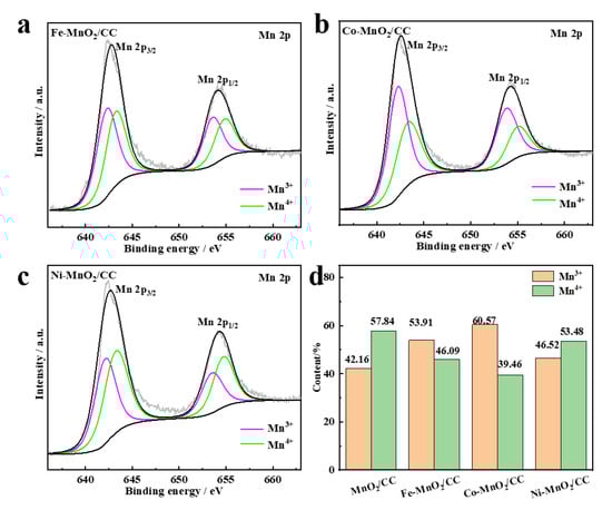 Fitted Mn 2p XPS spectra of Fe-MnO2/CC, Co-MnO2/CC and Ni-MnO2/CC are shown in Figure 5a–c, indicating Mn valences +three and +four [30], whose peak positions are listed in Table S2. After cation intercalation, no peaks of other Mn species are found, which indicates that MnO2 is retained, but the valence state of Mn fluctuates. Since Mn4+ prevailed in MnO2/CC (Figure 1e), it can be assumed that the introduction of transition metal ions altered the valence state of Mn. According to Figure 5d, Mn4+ and Mn3+ accounted for 57.84% and 42.16% of the initial MnO2, respectively. After the transition metal introduction, the content percentages of Mn4+ and Mn3+ changed significantly, especially in Co-MnO2/CC, where that of Mn4+ dropped to 39.46%, and that of Mn3+ increased to 60.57%. This can be explained by the gradual reduction of Mn4+ to Mn3+ to balance the charges of high valence transition metal ions.