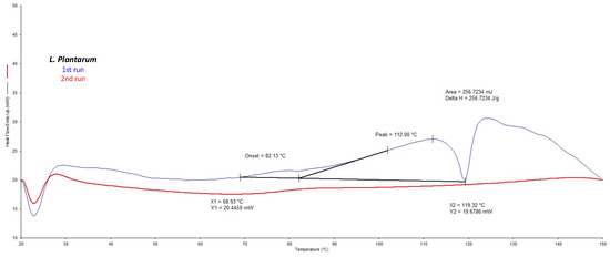 DSC analysis confirmed that the L. plantarum strain showed a phase transition temperature higher than L. acidophilus (73.0 °C) and L. rahmnosus (67.7 °C), ranging from 82 °C to 119 °C with a maxima at 112 °C (Figure 1). These transformations were not found to be reversible, as no transitions were observed during cooling and subsequent reheating of the samples. Thus, among the investigated bacteria, L. Plantarum from Danisco was selected as it was the thermally more resistant strain [33].