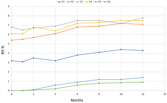 Monitoring of the RH over a period of 12 months for formulation 1 (F1, blue), formulation 2 (F2, orange), formulation 3 (F3, grey), formulation 4 (F4, yellow), formulation 5 (F5, light blue), and formulation 6 (F6, green).