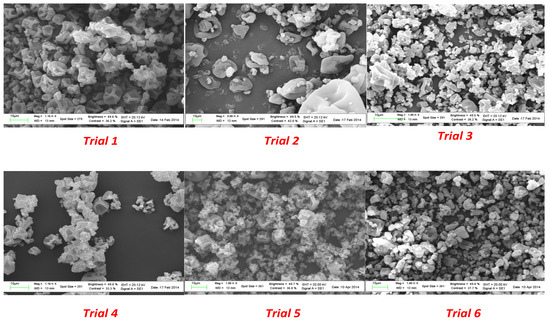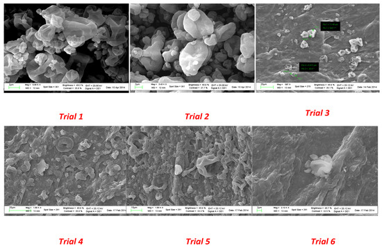 Scanning electron microscopy was also used to check the water resistance of the microparticles as well as the solubility in gastrointestinal medium. To this end, aliquots of each spray-dried powder were suspended in water for 2 h at room temperature to mimic the conditions occurring in the industrial production of capsules. As shown in Figure 4, particles from trial 1 to trial 3 revealed a higher resistance to aqueous environments. As the quantity of coating agent decreased (from trial 4 to trial 6), a partial modification of the surface morphology was observed.