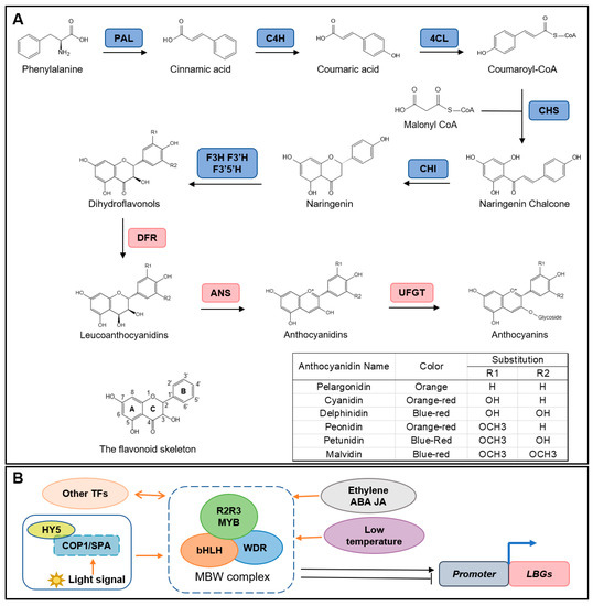 In plants, apart from the structure genes, related transcription factors, various environmental factors and internal phytohormones also affect anthocyanin biosynthesis (Figure 1B).