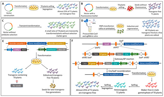 (3) Using transient expressing editor without antibiotic selection: genome modified constructs can be transiently expressed in plant cells by Agrobacterium and will not be integrated into the host genome. The transient expression vector does not include antibiotic selection units, so three populations exist in T0 plants: plants having foreign gene insertion, untransformed plants, and transiently transformed plants. So, it is time-consuming to identify transgene-free progeny with desired traits (Figure 2C) [117,121].