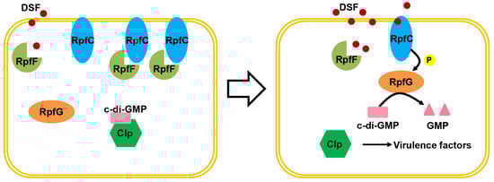 - Slater, H.; Alvare-Morales, A.; Barber, C.E.; Daniels, M.J.; Dow, J.M. A two-component system involving an HD-GYP domain protein links cell-cell signalling to pathogenicity gene expression in Xanthomonas campestris. Mol. Microbiol. 2000, 38, 986–1003. [Google Scholar] [CrossRef]