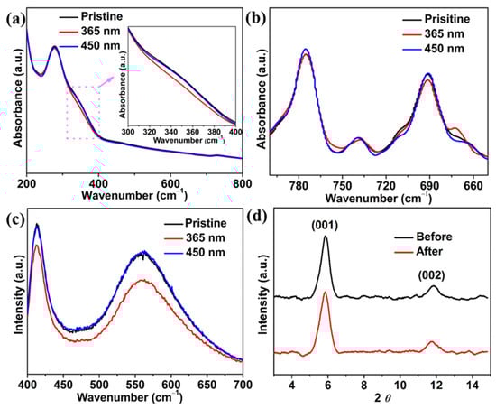 (a) UV–Vis (b) IRRAS, and (c) PL emission spectra of Cu2(AzoBPDC)2 film (pristine (black); after UV irradiation (red,); after visible light irradiation (blue)); (d) XRD patterns of Cu2(AzoBPDC)2 film before and after UV–Vis irradiation performed once.