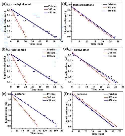 Diffusion flux of polar (a–c) and non-polar gas molecules (d–f) (the flow rate of methanol (a); acetonitrile (b); acetone (c); trichloromethane (d); diethyl ether (e), and benzene (f)) (pristine (black); after UV irradiation (red); after visible light irradiation (blue)).