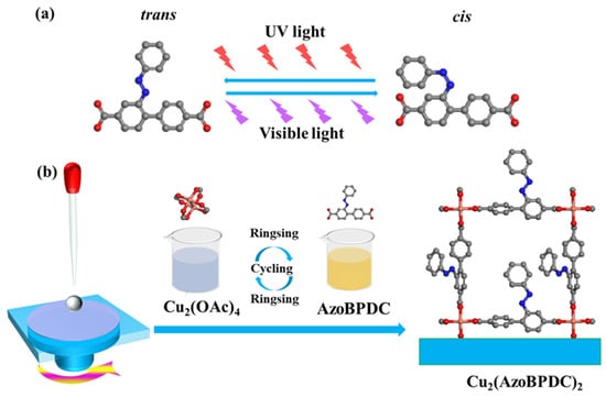 Schematic illustration of the switching of the AzoBPDC linker (a) and the preparation of the corresponding Cu2(AzoBPDC)2 thin film (b).