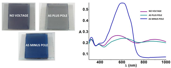 In the case of our electrochromic windows with two FTO glasses that are coated with two different electroactive polymers, e.g., in the device of Figure 1, the absorption spectra and thus the resulting colors of the windows are additive, that means are a superposition of the existing redox states of both polymers, and are influenced by layer thickness and film morphology [14,15,16]. Here, a clear relation of structural elements (occurrence of polarons and bipolarons) to the observed color of the window is much more complex, since the active layer containing two electroactive polymers can exist at several, different doping states for a given potential/voltage.