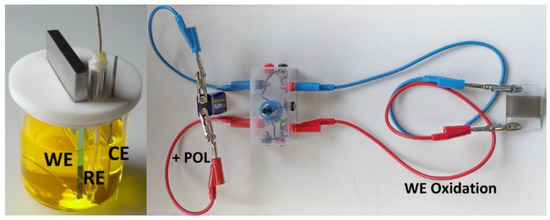 For checking the electrochromic characteristics of the assembled electrochromic window, the two RE/GE sockets at the potentiostat are shorted via a cable. A 9 V battery is connected to the potentiostat as indicated in Figure 3. A positive voltage at one polymer-coated glass leads to oxidation (oxidative doping) of the polymer material, a negative voltage to reduction (reductive dedoping). To change the polarity, the positive pole and negative pole can be exchanged.