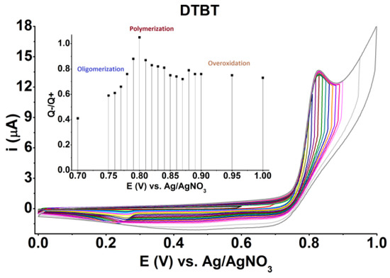 Before discussing the assembly of our electrochromic windows, let us briefly outline some general features of electropolymerizations. When tackling the electropolymerization of a new electroactive monomer, it is first appropriate to determine the optimum voltage at which the planned (electro)polymerization will be carried out. The three monomers DTBT, Py, and PEDOT, depicted in Scheme 1, (and others, e.g., bithiophene BT, carbazole Cz and aniline Ani) all polymerize oxidatively at the positive pole of the electrosynthesis cell, with cationic intermediates generated by anodic oxidation. If the voltage is too low, polymerisation does not occur at all or occurs only under formation of short chain oligomers. If the voltage is too high, so-called “over-oxidation” is the consequence, connected to the formation of structural defects. As an example, Figure 4 depicts the cyclovoltammetric (CV) current-voltage curves when electropolymerizing the dithienylbenzothiadiazole monomer DTBT into the corresponding polymer PDTBT (see Scheme 1). The differently coloured plots represent the current-voltage curves obtained from voltage cycles under repeated changes of the peak voltage at the working electrode, always starting at 0 V vs. Ag/AgNO3 and stepwise increasing the voltage to 0.7–1.0 V. In the inset diagram, the ratio Q-/Q+ represents the sum of the negative and positive charge carriers that are accumulated in one cycle. The ratio Q-/Q+ is calculated as the integral ratio between the respective current curves and the axis corresponding to a current of i = 0 A. In the DTBT case, the evaluation of the CV plots documents that the polymerisation proceeds most efficiently at a peak voltage of 0.8 V vs. Ag/AgNO3 [4,5].