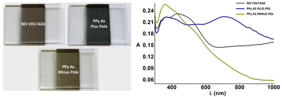 As a model system with only one (semi)conducting polymer, a polypyrrole PPy-based electrochromic window in which the second FTO glass is not coated with a second (semi)conducting polymer shows a grey to black color depending on the thickness of the PPy layer and the doping level. When PPy is fully reduced to the neutral state (connection to the negative -minus- pole), the color changes to yellowish (see Figure 6). When the PPy is oxidized (connection to the positive -plus- pole), a blueish color appears. The absorption spectrum now shows a long wavelength, doping-induced maximum at approx. 770 nm (Figure 6).