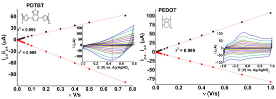 Plots of the reductive and oxidative currents maxima against the potential feed rates (scan rates) for films of electrochemically synthesized polymers PDTBT and PEDOT (the chemical structures of the polymers are shown as insets).