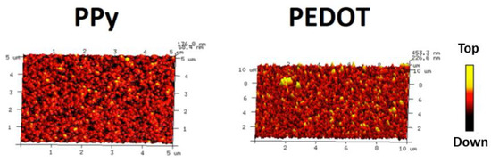Electropolymerized layers generally show a typical, granular morphology, caused by the localized and irregularly starting nucleation process on the electrode. Although, the AFM images from Figure 9 show that the electrochemically synthesized polymer layers exhibit certain morphological differences. For the cutout of the surface of a PPy layer in Figure 9, the difference between highest peak and deepest valley is approx. 68 nm, as a measure of the bumpiness of the layer. For the PEDOT layer this difference is, with approx. 227 nm, around three times higher. This translates into a mean average roughness of 14 nm for the PPy and 43 nm for the PEDOT layer.