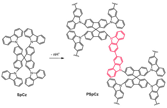 Oxidative electropolymerization of the tetrafunctional monomer SpCz into the corresponding polymer network PSpCz.