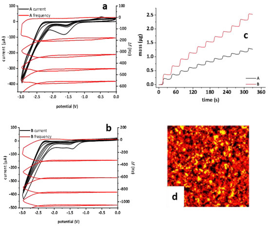 For electrochemical polymerization and characterization, an electrochemical workstation PAR VersaSTAT 4 was used in combination to a three-electrode cell and connected to a QCM922A oscillator for the EQCM experiments. The AFM images were obtained with an atomic force microscope (AFM) BrukerdiInnova operated in tapping mode. Average surface roughness and thickness of the films were extracted from the topography images. The electrochemical quartz crystal microbalance (EQCM) technique, also called electrogravimetry, represents a powerful method for recording small mass changes (up to the pg scale) at the electrodes. The method can be coupled with simultaneous electrochemical measurements, e.g., cyclic voltammetry. The mass variations result from frequency changes (f) of a quartz crystal resonator.