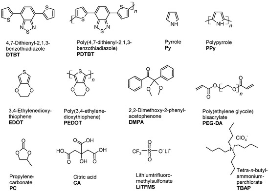 The equipment also includes an UV lamp (laboratory hand lamp) or UV LEDs (λ = 365 nm) to drive the photopolymerization and an UV-VIS spectrophotometer to record the solid-state transmission (absorption) spectra. Detailed instructions for the assembly of the potentiostat and the synthesis cell as well as for the investigation of the electrochromic windows are available online (Ph.D. thesis of I. N. R.-E.) at https://chemiemitlicht.uni-wuppertal.de/de/dissertationen.html [3]. Scheme 1 shows the chemical formula, names and abbreviations of the main compounds used in the synthesis of the layers as well as the assembly and characterization of the electrochromic properties of the double-glazed electrochromic window from Figure 1. The selection includes: (i) Three monomers for the synthesis of the corresponding (semi)conducting electrochromic polymers (PDTBT, PEDOT and PPy), (ii) the prepolymer PRG-DA and the radical initiator DMPA for photopolymerization of the solid-state electrolyte layer that connects the two polymer-coated glass substrates, and (iii) additives (Li-TFMS, TBAP) that provide sufficient charge carrier mobility during electropolymerization (TBAP) and in the electrochromic device (LiTFMS).