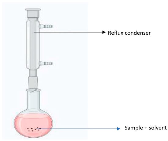 Reflux extraction is the solid–liquid extraction method, as shown in Figure 4, where solvent evaporation and condensation are carried out for 1–3 h at a constant temperature (60–80 °C) [111]. The reflux method is widely used for the extraction, quantification, and evaluation of various phytochemicals and essential oils from plant sources. The average extraction temperature and time using mixed solvents (water and ethanol) have been reported to be 60–80 °C and 80–120 min, respectively [112]. The extraction efficiency of this method varies from 70 to 90% [145]. The boiling point of the solvent and extraction time are the two most important regulating factors in this approach. Depending on the criteria being followed, extraction should continue until asymptotic levels or exhaustive circumstances are attained. This method provides fine control over the temperature and hence can prevent the loss of organic compounds [114,144]. The major limitation of this method is its unsuitability for the extraction of thermolabile components [144].