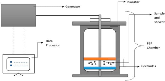 Pulsed electric field extraction (PEF) is a non-thermal technique of extraction in which a direct high electric current is applied using either a batch method (100–300 V/cm) or a continuous method (20–80 kV/cm) for a short time interval (nanoseconds to microseconds) to a product placed between two electrodes [121,123]. This makes the sample’s cell membrane more conductive, porous, and permeable and allows substances trapped inside the cell membrane to flow through into the surrounding fluid (Figure 9). Extraction is carried out at 20 to 50 °C with the time ranging from 5 min to 48 h. It has an estimated extract yield of about 76 to 85% [121,122]. Pulse parameters, treatment medium, and the physicochemical attributes of cells are major factors influencing the degree of electroporation in pulsed electric field extraction. The degree of electroporation may be affected by pulse characteristics such as electric field strength, pulse duration, pulse polarity, and pulse frequency. Tissue parameters such as size, thickness, structure, ionic mobility, and water content also influence the rate of electroporation [164]. PEF has been used as a non-thermal intensification approach to boost oil yield extraction from sunflower seeds. After treating sunflower seeds for the 30 s under an electric field of 7.0 kV/cm with a frequency of 15 Hz, solvent content of 40 wt percent, and a pulse width of 30 s, oil extraction increased by 9.1% [165]. PEF can be employed for the extraction of water-soluble proteins [166]. Chemical and electrochemical reactions such as electrode fouling and corrosion are considered serious drawbacks when high-intensity treatment is carried out [167].