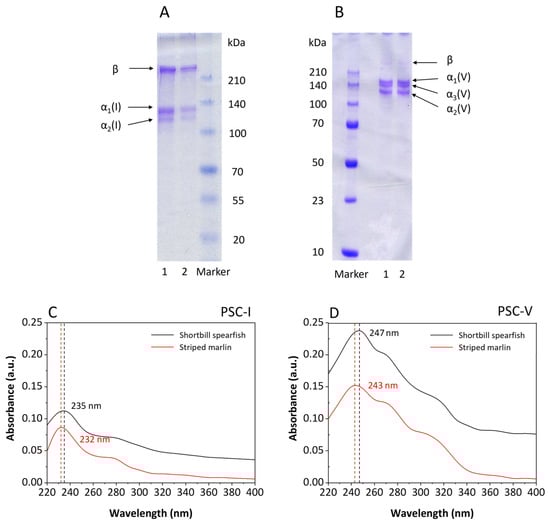 The UV-Vis spectrum of PSC-I and PSC-V isolated from the skin of shortbill spearfish and striped marlin are shown in Figure 1C,D, respectively. An absorption maximum was observed in the range from 232 to 247 nm irrespective of the samples. The absorbances at 280 nm of the PSC-I and PSC-V were low in both samples (0.037 and 0.073 for shortbill spearfish and 0.036 and 0.057 for striped marlin, respectively), indicating that most non-collagenous proteins were removed. Normally, it is well-known that the triple-helical collagen possesses the characteristic of a high peak at 230–240 nm but low at around 280 nm due to the small amount of tyrosine [29,33]. However, the UV-Vis spectrum of Figure 1C,D showed varying degrees of redshift, demonstrating that a part of the collagen was hydrolyzed by pepsin to form a small amount of peptide during the extraction process. The redshift of the UV spectrum was due to the -NH2 on the side chain of collagen peptide. Based on the redshift in Figure 1D, it was speculated that the highly polymerized part of type V collagen had been slightly hydrolyzed during pepsin treatment, which also explained the presence of the trace β chain in Figure 1B. These results suggest that PSC-I and PSC-V isolated from the skin of shortbill spearfish and striped marlin possessed a complete triple helix structure with high purity.