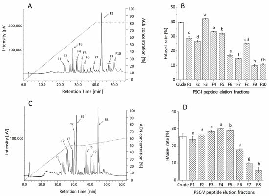 Purification profile and HAase-I rate of fractions of PSC-I peptide < 30 kDa (A,B) and PSC-V peptide < 30 kDa (C,D) by RP-HPLC. Different superscripts note the significant differences as compared with the crude sample (p < 0.05).