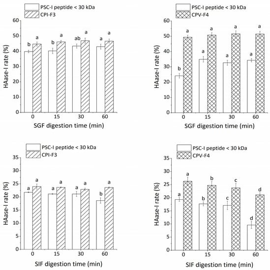 The stability of CPI-F3 and CPV-F4 under SGF and SIF digestion. Different superscripts of the same sample note the significant differences (p < 0.05). All results are mean ± SD from three determinations.