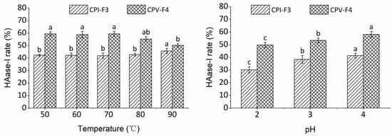 The stability of CPI-F3 and CPV-F4 under different treatments of temperature and pH is shown in Figure 5. On the one hand, the HAase-I rate of CPI-F3 showed no significant change (p > 0.05) at the temperature range of 50–80 °C, indicating that CPI-F3 is thermally stable and could be used in heat processing. The HAase-I rate of CPV-F4 produced no significant difference (p > 0.05) under the conditions of 50–70 °C but gradually decreased after being treated by temperature above 80 °C. As compared with CPI-F3, CPV-F4 is less thermally stable and cannot be subjected to excessive thermal conditions.