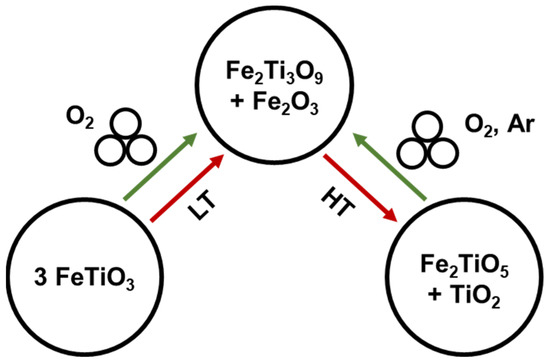 The mechanochemical ball milling (indicated by the three-circles symbol introduced by Rightmire and Hanusa) [28] and thermochemical low-temperature (LT) and high-temperature (HT) transformations of ilmenite. Adapted from [73].