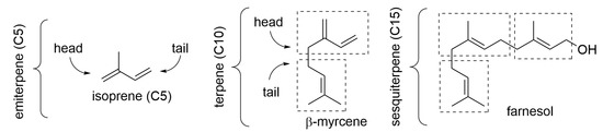 Terpenoids (Figure 1) are biosynthesized though the mevalonate pathway and are built by formally connecting isoprene units as C5 building blocks. (The actual building blocks are isopentenyl pyrophosphate and dimethylallyl pyrophosphate.) The majority of compounds contain two or three isoprene units and are called terpenes or sesquiterpenes, respectively. They owe their name to the wrong initial identification of the C10 unit as the recurrent building block, which was called terpene; therefore, the C15 molecules were identified as containing one and a half terpenes (from the Latin “semis” = half + “atque” = and, contracted to “sesqui”) (Figure 1) [5]. Although the plant contains components up to C30 (6 isoprene units), those larger than C15 (i.e., diterpenes and triterpenes) are rarely present in the EO since they are not sufficiently volatile to pass into the distillate. Formally, the term “terpene” refers only to hydrocarbons, i.e., those components having no heteroatoms, while the term “terpenoids” broadens to include oxygenated or heteroatoms-containing compounds although in common practice, this distinction is normally overlooked. A selection of common terpenoid components found in EOs is shown in Figure 2.