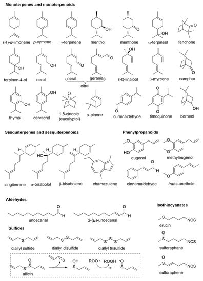 Most of their use is as aroma and flavor components in food or beverages; however, some more specific functions have been extensively investigated in recent years [5], particularly their role as natural food preservatives [13,14,15,16] owing to their antimicrobial properties [17,18] and to their antioxidant properties [19,20,21] or to an advantageous combination of both.