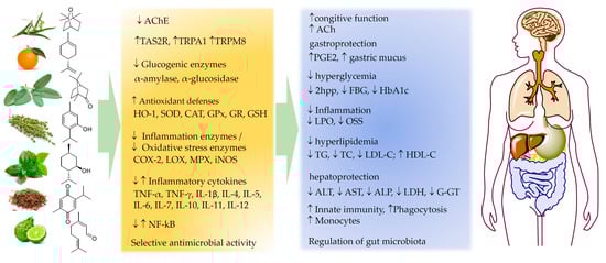 While a number of recent reviews has been dedicated to the use and potential of essential oils as food preservatives [13,14,15,16], comparably lower evidence has been given to other functional roles of essential oils or their components in food products, which are nonetheless accumulating a body of scientific support and substantial public interest: their health-promoting role beyond preservation and basic nutrition. Several functional roles of EOs have been extensively investigated and commercially explored in production animals’ nutrition, e.g., as additives to promote animal health and welfare and their action as immunomodulators, digestive stimulants, and natural substances that can increase the performance of animal products, replacing the need for antibiotics or other restricted additives [22,23]. Aim of this review is to offer an updated overview on the potential and on some viable applications of essential oils and their components as health-promoting ingredients of nutraceuticals and diet supplements or food products in human nutrition. Priority is given to the most recent advancements (last 10 years) without any aim to systematically cover the matter but rather to offer a picture of some promising directions for further development. Specific topics, such as the antimicrobial and antioxidant activities of essential oils, are deliberately excluded, as they have already been addressed by numerous recent reviews.