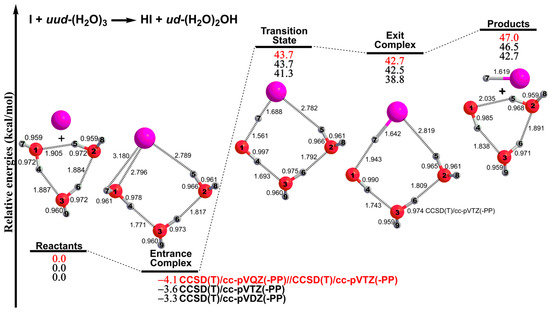 Three different kinds of reaction pathways are predicted when an iodine atom approaches the water trimer (H2O)3 from different directions, as the MPW1K/cc-pVTZ(-PP) results show in Figure S1 in the Supplementary Materials. These pathways are similar in both energetics and structures, just as those for the F/Cl/Br + (H2O)3 reactions. To obtain more reliable predictions, the CCSD(T) method was adopted to further investigate the lowest-lying pathway, with basis sets up to cc-pVTZ(-PP) for geometry optimizations and vibrational frequency analyses and cc-pVQZ(-PP) for single-point energy computations. Thus, the following discussions are based on CCSD(T)/cc-pVTZ(-PP) geometries and vibrational frequencies and the CCSD(T)/cc-pVQZ(-PP)//CCSD(T)/cc-pVTZ(-PP) energetics, unless otherwise specified.