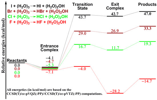 We also compare the potential energy profile of the I + (H2O)3 reaction with those for the Br + (H2O)3, Cl + (H2O)3 and F + (H2O)3 reactions. All five stationary points for the four reactions are geometrically related [16,17,18], while the landscape profiles of the four reactions are quantitatively different, as shown in Figure 3. The entrance well for I∙∙∙(H2O)3 lies below the reactants by 4.1 kcal mol−1, slightly shallower than the 4.7 kcal mol−1 for bromine, 5.3 kcal mol−1 for chlorine, and 7.1 kcal mol−1 for fluorine. The relative energies of the other stationary points (i.e., the transition state, exit complex and products) display significant differences. Taking the transition state as an example, the relative energy of 43.7 kcal mol−1 for the I + (H2O)3 reaction is much higher than that of 29.0 kcal mol−1 for the Br + (H2O)3 reaction. The analogous barriers are 16.7 kcal mol−1 for the Cl + (H2O)3 reaction and −4.0 kcal mol−1 for the F + (H2O)3 reaction. The endothermic energy decreases from 47.0 kcal mol−1 for the I + (H2O)3 reaction to 33.3 kcal mol−1 for the Br + (H2O)3 reaction and to 19.3 kcal mol−1 for the Cl + (H2O)3 reaction, while it is exothermic (by −14.7 kcal mol−1) for the F + (H2O)3 reaction. These energy differences should be related to the bond energy order of H–I (3.05 eV) < H–Br (3.76 eV) < H–Cl (4.43 eV) < H–F (5.87 eV) [29].