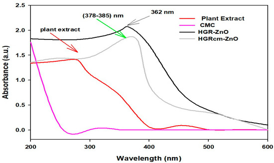 UV-Visible spectra of ZnO-NPs synthesized using a hydroponic ginseng root extract, those coated with CMC (HGRCm-ZnO NPs), plant extract alone, and CMC alone are shown in Figure 1. The successful formation of ZnO-NPs was indicated by the presence of a peak at 362 nm. Moreover, the plant extract showed a broader peak at 280 nm, representing the polyphenolic compound mainly responsible for nanoparticle formation and neutralizing the metal ion [44]. CMC-coated nanoparticles were characterized by peaks at 378–385 nm due to the presence of CMC strongly bonded with amine groups and metal ions [45]. Additionally, metal nanoparticles are known to combine with polyphenols, including anthocyanin, a highly reactive substance; therefore, we examined if an anthocyanin peak was present [33]. Phytochemicals (phenol, flavonoid, and rutin) present in ginseng root function as reducing agents, converting metal Zn+2 to Zn0, which also represent stable nanoparticles. The plant extract contained the polyphenolic group and other phytochemicals that showed an absorption zone at 280 nm, whereas ZnO NPs had a sharp peak at 362 nm. However, the plant extract alone had no sharp peak on the metal nanoparticle formation area. Zinc nitrate salt is converted to zinc ions and further processed to stabilized zinc metal due to reduction by phytochemicals in ginseng root. The CMC polymer containing amines bonded strongly with metal ions in the ZnO NPs and acted as a coating agent.