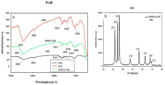 (A) Fourier transforms infrared analysis (FT-IR) for CMC (Black), hydroponic ginseng root (Red) and HGRCm-ZnO NPs (Green) and (B) XRD analysis of hydroponic ginseng root CMC-coated ZnO NPs (HGRCm-ZnO NPs (Black).