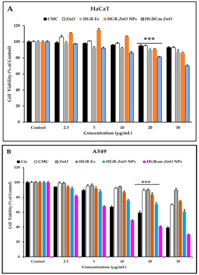 Cell viability of HGRCm-ZnO NPs, CMC, root extract, and cisplatin based on the MTT assay. (A) HaCaT cells; (B) A549 cells. Each bar represents the mean ± SE of duplicate samples from three independent experiments (*** p < 0.001 using Student’s t-test compared to the control.).