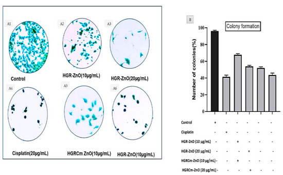 A549 lung cancer cells were seeded at a concentration of 1 × 103 in the wells of a 6-well plate, and after 48 h, cells were treated with different concentrations (5, 10) µg/mL of HGRCm-ZnO NPs. Control cells were treated with 0.1% DMSO. After 1 day of incubation, the old cell media were removed, and new media were added for 7 days. Colonies were fixed with glutaraldehyde and stained with crystal violet. Images were captured under a microscope, and colony number was counted and plotted. All data were analyzed using Image J software