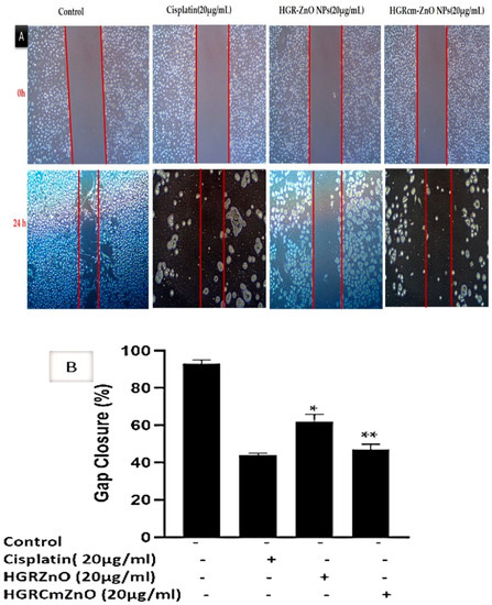 Overall, 90% of cancer deaths are due to cancer metastasis; therefore, the prevention of cancer metastasis is a major goal of cancer treatment [53]. Cell migration as cancer progresses determines the ability of tumor cells to escape from primary tumors and invade nearby tissues to become metastases. A scratch migration assay was performed to determine if HGRCm-ZnO NPs affected the migration of A549 cells. A549 lung cancer cells were treated with HGRCm-ZnO NPs (20 µg/mL), and cell migration (%) was evaluated using a wound closure assay before and after the treatment of cells (Figure 6A,B). Cells treated with HGRCm-ZnO NPs showed strongly inhibited migration after 24 h. The percentage of A549 lung cancer cells that migrated toward the scratch area was 92.0 ± 0.8% for untreated control cells, 60.0 ± 0.2% for those treated with HGR-ZnO NPs (without CMC), 45.0 ± 0.4% for those treated with HGRCm-ZnO NPs, and 39.0 ± 0.6% for those treated with the positive control drug cisplatin (Figure 6B). These results indicate that HGRCm-ZnO NPs have the ability to inhibit cell migration and cancer cell metastasis. After 24 hours, practically all gaps between cell layers in the control group were covered by migrating cells. Additionally, cancer cells treated with HGRCm-ZnO NPs displayed better migratory inhibition ability than the control group and ZnO NPs (without CMC). In contrast, due to the decreased migratory capabilities of HGRCm-ZnO NP-treated cells, scraped areas were still apparent. The capacity of HGRCm-ZnO NPs to suppress growth may indicate that it is a potential anti-lung cancer agent.