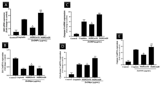 Effects of HGRCm-ZnO NPs on mRNA expression levels of apoptosis-related genes in A549 cells. Here, A549 cells were treated with HGRCm-ZnO NPs at 10 and 20 μg/mL for 24 h. Total RNA was then extracted, and transcript expression levels were determined by qPCR analysis using primers targeting (A) BAX, (B) Bcl-2, (C) Caspase 9, (D) Cytochrome C, and (E) Caspase 3. Each bar represents the mean ± SE of duplicate samples from three independent experiments. * p < 0.01; ** p < 0.01 using Student’s t-test compared to the non-treated control).