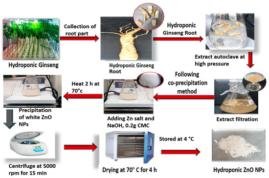 A previously described co-precipitation method was performed to prepare HGR-ZnO NPs with slight modification [59]. In the following process, zinc nitrate and sodium hydroxide were used as oxidizing salt and precipitating precursor, respectively. Metal nitrates are extremely soluble and have an oxidizing capacity and are ideal for the preparation of nanoparticles. Distilled water was used to wash away unreacted salt and phytochemicals from the nanoparticles. At first, ten percent (20 mL) hydroponically cultured ginseng root extract (w/v) was dissolved in distilled water (80 mL) under stirring, and 0.1 mM of zinc nitrate salt was then added. The solution was stirred continuously (500 rpm) on a hotplate with the temperature maintained at 65 to 70 °C. Then, 0.2 M of NaOH-prepared solution was mixed slowly dropwise into the hot solution over 2 h. The solution was permitted to become cold without stirring and then centrifuged at 8000 rpm for 15 min to eliminate unmixed impurities. After completion of the reaction, the white precipitate that formed was permitted to settle, and the supernatant was removed. The formed GR-ZnO NPs were cleaned with DW three times to remove unreacted substances and dried at 60 °C for 4 h in an oven. During this drying period, the Zn (OH)2 in the NPs converted fully into white color ZnO NP powder (Figure 10).